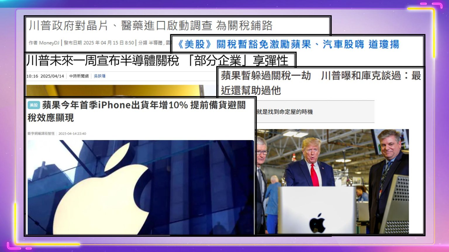 暫緩實施關稅讓近期受到高關稅威脅的美國科技業,出現一線生機,川普昨天表示,他最近曾和蘋果公司的執行長庫克談話,川普還稱「最近幫助過庫克和整個生意」。川普表示,雖然沒有改變對等關稅政策的基本立場,但他還是有彈性的,外界對此解讀為,暗示美國先前暫緩手機等電子產品對等關稅,與蘋果遊說有關