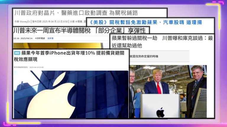 川普政府上週表示,針對多國商品的10%對等關稅,暫時延後90天實施,同時豁免手機、電腦、通訊設備、半導體等多項科技產品對等關稅,讓市場認為,這是為了蘋果、Meta、亞馬遜等業者「開後門」,讓產業暫時得到喘息
