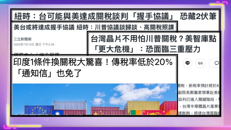 美國總統川普近日發出4波關稅信函,不過台灣至今仍未獲通知。根據《紐約時報》報導,台灣跟印度可能很快與華府達成「握手協議」。